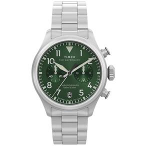 Relógio Timex Waterbury Ace Cronograph TW2Y19100 O Timex Waterbury Ace Cronograph TW2Y19100 é um clássico Americano, o Waterbury Ace é uma releitura sofisticada do relógio de piloto tradicional, apresentando uma nova caixa de 41 mm em aço inoxidável reciclado escovado, confiante e refinado. Seu mostrador preto com padrão sunray, limpo e de alto contraste, garante verificações rápidas de tempo com algarismos arábicos, ponteiro dos segundos elegante e minimalista, dispensa o característico W da Waterbury, permitindo que a estética militar do relógio brilhe. Outros detalhes incluem uma janela de data às 6 horas, ponteiros luminosos, pulseira em aço inox e um fecho borboleta para um visual perfeito. Especificações Técnicas Mecanismo: Quartzo Analógico bateria Gênero: Masculino Visor: Verde Vidro: Cristal Mineral Funções: calendário, cronógrafo, ponteiros e marcadores das horas fosforescentes. Prova d'água: 100m Características: com caixa e pulseira em aço inoxidável, fecho borboleta .Diâmetro da caixa: 41 mm Largura da Pulseira: 20 mm : 1 ano pelo fabricante Timex Marca: Não Informado Ean: 7909669218456