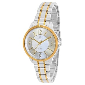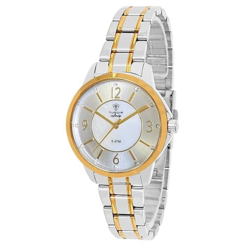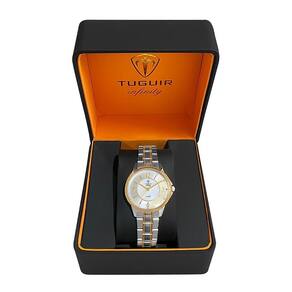 Funções: Analógico Resistência à Água: 50m Diâmetro da Caixa: 34 mm Características: com caixa em Aço e pulseira em Aço Vidro: Cristal Mineral Fundo rosqueado Alimentação do maquinário: Bateria Mostrador Prateado com números, pedras e detalhe estilo madreperola branco Linha: Tuguir Infinity Prateado com Dourado