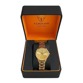 Funções: Analógico Resistência à Água: 50m Diâmetro da Caixa: 34 mm Características: com caixa em Aço e pulseira em Aço Vidro: Cristal Mineral Fundo rosqueado Alimentação do maquinário: Bateria Mostrador Dourado com todos os números e pedra Linha: Tuguir Infinity