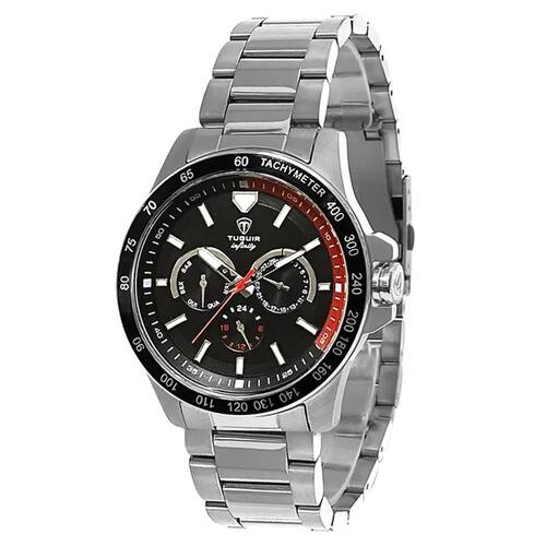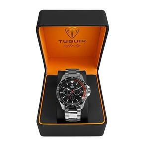 Funções: Analógico, Multifunção Calendários Mensal e Semanal e Horário em 24h Resistência à Água: 50m Diâmetro da Caixa: 45 mm Características: com caixa em Aço e pulseira em Aço Vidro: Cristal Mineral Fundo Rosqueado Alimentação do maquinário: Bateria Mostrador Preto com detalhe em vermelho Aro Preto Fixo Linha: Tuguir Infinity