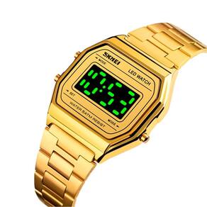 Relógio Unissex Skmei Digital 1646 Dourado Relógio Unissex Skmei Digital 1646 Dourado Marca: Skmei Categoria: Digital Analógico: Não Digital: Sim 1 Horário Calendário: Sim Despertador: Não Mostra o Dia da Semana: Sim Mostra o Dia do Mês: Sim Cronômetro: Não Contador Regressivo: Não Luz: Sim Cor da Iluminação: Verde Resistente à Água: 3 ATM Resiste a imersões breves - Respingos: Sim - Chuva: Sim - Lavar Carro: Sim - Lavar Louça: Sim - Natação: Não - Mergulho: Não Característica do Vidro: Acrílico Tipo de Fecho: Gancho Cor da Caixa: Dourado Material da Caixa: Metal Banho IP Formato da Caixa: Quadrado Comprimento da Caixa: 33,30 mm Largura da Caixa: 34,10 mm Espessura da Caixa: 9,40 mm Cor da Pulseira: Dourado Material da Pulseira: Aço Largura da Pulseira: 4,90 mm Comprimento Máximo da Pulseira: 220,00 mm Alimentação: Bateria Interna Peso Líquido: 0,580 Kg Modelo: 1646 Cor Predominante: Dourado : 12 Meses Conteúdo da Embalagem: 01 Relógio 01 Embalagem 01 Termo de Marca: Não Informado