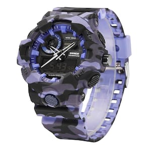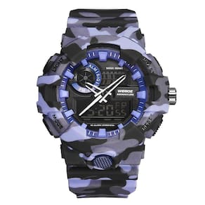 Características: com caixa em Policarbonato camuflado azul e pulseira em Poliuretano camuflado azul