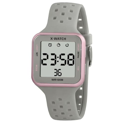 Características: com caixa em Resina Rosa com detalhes prateados e pulseira em Silicone Cinza