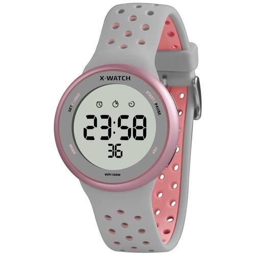 Relógio X-Watch Feminino Ref: Xfppd039w Bxgr Esportivo Digital DESCRIÇÃO DO PRODUTO: Funções: Digital, Iluminação, Calendário, Cronógrafo, Alarme, Timer Resistência à Água: 100m Diâmetro da Caixa: 43 mm Características: com caixa em Resina Rosa com detalhes prateados e pulseira em Silicone Cinza com detalhes rosa Vidro: acrílico Fundo Parafusado Alimentação do maquinário: Bateria Mostrador Cinza com detalhes em rosa e preto de 1 Ano Marca: Não Informado