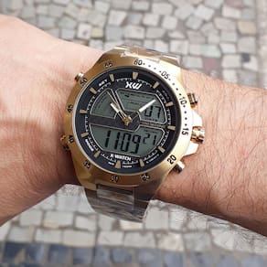 Relogio x-watch masculino digital analogico de aço xmgsa004w Fabricante: orient relógios da amazônia ltda Tamanho da caixa: 50 mm grande medida sem coroa Tamanho da caixa: 52 mm medida com coroa Espessura da caixa: 15,5 mm Comprimento da pulseira: 21 cm Peso: 195 gramas Funções: - luz - cronômetro - alarme - função chime: sim bip de hora cheia; aviso de hora em hora - calendário - dual time : 12 meses em toda a rede de assistências orient no brasil - tampa posterior : rosqueado Material da caixa: aço inoxidável Material da pulseira: aço inoxidável Possui calendário: sim Resistência a água: 100 metros Pode lavar as mãos Sim Pode tomar banho de chuveiro Sim Pode usar em piscina: sim Pode usar em mergulho profundo Não Acompanha: Estojo x-watch Certificado de Manual Marca: Não Informado