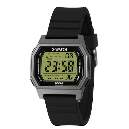 Características: com caixa em Resina Grafite e pulseira em Silicone Preta