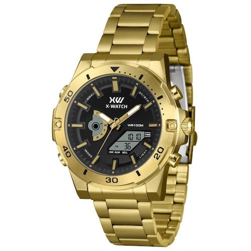 Relógio X-Watch Masculino Ref: Xmgsa015 P1kx Anadigi Dourado DESCRIÇÃO DO PRODUTO: Visor: LCD Funções: Anadigi, Calendário, Iluminação, Alarme, Cronógrafo Resistência à Água: 100m Diâmetro da Caixa: 48 mm Características: com caixa em Aço e pulseira em Aço Vidro: Cristal Mineral Fundo Rosqueado Alimentação do maquinário: Bateria Mostrador Preto com detalhes em dourado Aro fixo dourado de 1 Ano Marca: X-Watch