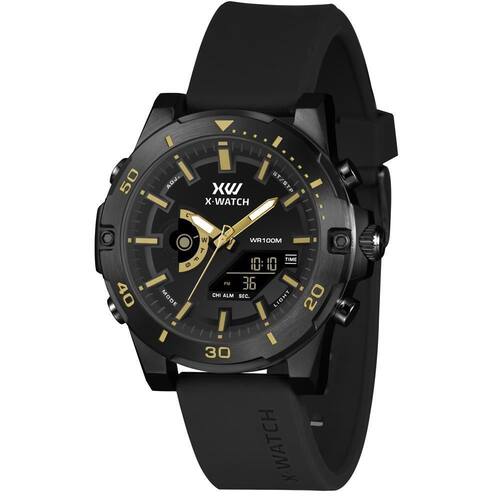 Relógio X-Watch Masculino Ref: Xmnsa007 P1px Anadigi Black DESCRIÇÃO DO PRODUTO: Visor: LCD Funções: Anadigi, Calendário, Iluminação, Alarme, Cronógrafo Resistência à Água: 100m Diâmetro da Caixa: 48 mm Características: com caixa em Aço e pulseira em Silicone Preta Vidro: Cristal Mineral Fundo Rosqueado Alimentação do maquinário: Bateria Mostrador Preto com detalhes em dourado Aro fixo preto de 1 Ano Marca: Não Informado