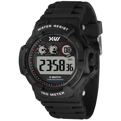 Relógio X-Watch Masculino Ref: Xmppd680 Pxpx Esportivo Digital DESCRIÇÃO DO PRODUTO: Funções: Digital, Iluminação, Calendário, Cronógrafo, Alarme, Timer, Dual Time Resistência à Água: 100m Diâmetro da Caixa: 51 mm Características: com caixa em Resina Preta e pulseira em Silicone Preta Vidro: acrílico Fundo Parafusado Alimentação do maquinário: Bateria Mostrador Preto com detalhes em branco, vermelho e azul de 1 Ano Marca: Não Informado Ean: 7891529993583