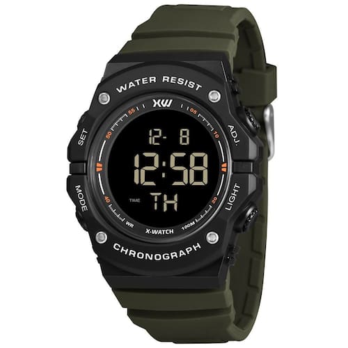 Características: com caixa em Resina Preta e pulseira em Silicone Verde