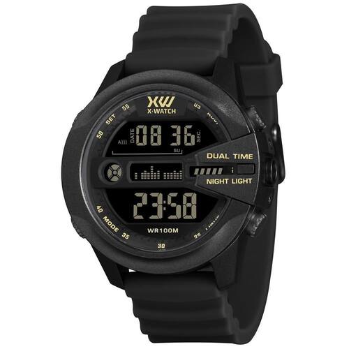 Relógio X-Watch Masculino Ref: Xmppd803 Pxpx Esportivo Digital DESCRIÇÃO DO PRODUTO: Funções: Digital, Iluminação, Calendário, Cronógrafo, Alarme, Timer, Dual Time Resistência à Água: 100m Diâmetro da Caixa: 48 mm Características: com caixa em Resina Preta e pulseira em Silicone Preta Vidro: acrílico Fundo Parafusado Alimentação do maquinário: Bateria Mostrador Preto com detalhes em dourado de 1 Ano Marca: Não Informado Ean: 7891529271230