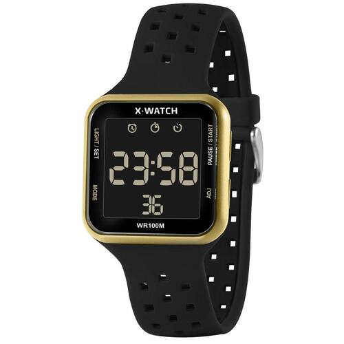Relógio X-Watch Masculino Ref: Xgppd093w Pxpx Esportivo Digital DESCRIÇÃO DO PRODUTO: Funções: Digital, Iluminação, Calendário, Cronógrafo, Alarme, Timer Resistência à Água: 100m Diâmetro da Caixa: 38 mm x 38 mm Características: com caixa em Resina Dourado e pulseira em Silicone Preta Vidro: acrílico Fundo Parafusado Alimentação do maquinário: Bateria Mostrador Preto com detalhes em branco e dourado Garantia de 1 Ano Marca: X-Watch