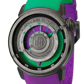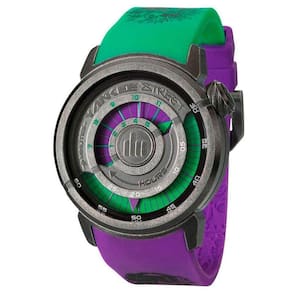 Relógio Yankee Street Masculino YS30158G. Possui mecanismo Analógico, pulseira na cor roxa e verde, fabricado em silicone, e possui fecho fivela, vidro fabricado em cristal mineral e visor cinza-grafite. A caixa na cor cinza-grafite (peça onde fica o mostrador) é fabricada em aço, medindo 4,7 cm de diâmetro e 1,3 cm de espessura, no formato redondo. O Relógio Yankee Street tem nível de resistência à água especificado em 100m/10atm.
