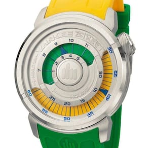 Relógio Yankee Street Masculino YS30167X. Possui mecanismo Analógico, pulseira na cor vermelha com azul, fabricado em silicone, e possui fecho fivela, vidro fabricado em cristal mineral e visor prata, amarelo e verde. A caixa na cor prata (peça onde fica o mostrador) é fabricada em aço, medindo 4,7 cm de diâmetro e 1,3 cm de espessura, no formato redondo. O Relógio Yankee Street tem nível de resistência à água de 100m/10atm.