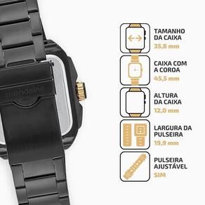 Marca: mondaine Referência: 32546GPMVHE4 Modelo: Espelhado Ficha Técnica: Formato da caixa: Quadrado Gênero: Masculino Cor: Preto Cor do mostrador: Preto Material da Pulseira: Aço inoxidável Material da Caixa: Aço inoxidável Mostrador: Analógico Mecanismo: Quartz Nivel de Resistência à Agua: 3 ATM 30 metros Material do Vidro: Cristal Mineral Tipo de Fecho: Dobrável com trava Tipo de Coroa: Botão padrão Fundo: Pressão Medidas: Pulseira Ajustável: Sim Tamanho da Caixa: 35,8 mm Altura da Caixa: 12,0 mm Dimensões da Caixa com a Coroa: 45,5 mm Largura da Pulseira: 19,9 mm Itens Inclusos: Funções: - 3 ponteiros - indexes fosforecentes - calendário dia do mês de 12 meses para todo o Brasil. Marca: Não Informado