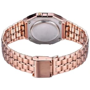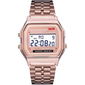 -cronômetro de 1/100 de segundo -alarme -iluminador em LED -pulseira de aço inoxidável - Design retrô popular -vidro com resina -material do corpo/garra: Resina / Dourado -pulseira de Aço Inoxidável -fecho ajustável