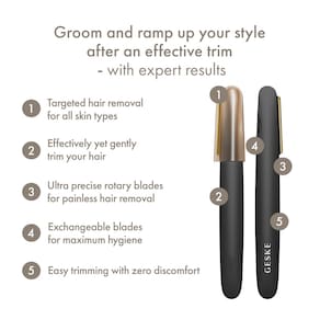 Aparador de precisão GESKE | 4 em 1 | Removedor de cabelo higiênico e indolor | Ferramenta precisa de corte de cabelo | Rosto e corpo | Homens e mulheres | Dispositivo de higiene | Lâminas hipoalergênicas e fáceis de trocar | Todos os tipos de pele - ? BENEFÍCIOS: Desfrute de uma depilação precisa e indolor no rosto e no corpo com nossas lâminas hipoalergênicas de corte de precisão. A maneira mais rápida, fácil e higiênica de aparar o cabelo sem dor! - ? INDOLOR: É hora de esquecer as depiladoras tradicionais e dizer olá à experiência de depilação mais confortável e sem dor! Nosso aparador de precisão não irrita a pele nem causa dor. - ? PRECISO: as lâminas de contorno de microprecisão garantem um corte direcionado, tornando o dispositivo adequado para áreas pequenas e grandes. - ? HIGIÊNICO: As lâminas são fáceis de trocar e adequadas para todos os tipos de pele. Assim, sua pele fica protegida contra infecções e você tem a garantia de um corte suave em todos os momentos. - ? VANTAGEM DO APLICATIVO INTELIGENTE: escaneie sua pele e obtenha sua rotina personalizada de cuidados com a pele. Descubra centenas de horas de sessões guiadas por vídeo para todos os dispositivos GESKE.