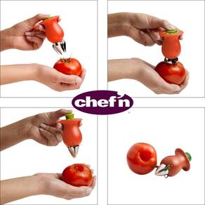 Basta pressionar um botão para que as garras serrilhadas abram e limpem o tomate, facilitando a preparação de saladas ou com recheios diversos.