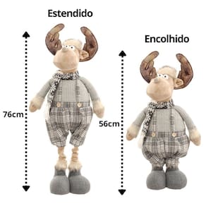 -01 Unidade Rena Decorativa Natalina Retrátil e Expansível – Pelúcia Luxo em Cinza e Bege, com Gorro e Cachecol de Crochê 76cm
