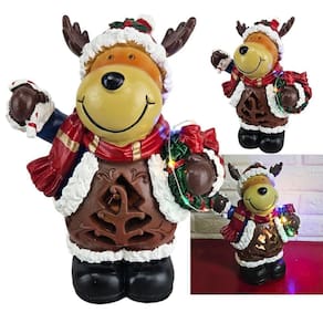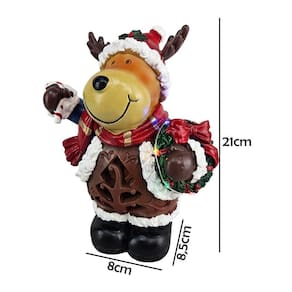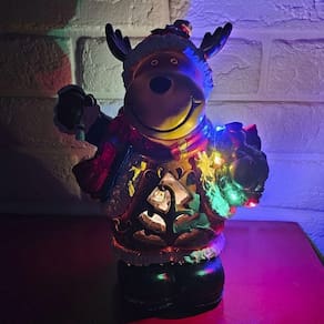 Quando ligada, ela acende! A arvore vazada na barriga brilha intensamente, e a mini guirlanda de Natal que ela carrega se ilumina com luzes coloridas de LED.