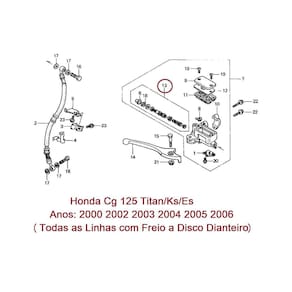 Reparo Cilindro Freio Dianteiro Honda Cg 125 Titan Es Imagens de motocicletas quando houver são meramente ilustrativas Itens inclusos: 1 cilindro interno; 1 mola; 2 gaxetas; 1 anel de trava; 1 guarda pó. Aplicação: Honda cg 125 titan es/ks/esd Anos: 2000 2003 2004 2005 2006 todas as linhas com freio a disco dianteiro Codigo da peça honda: 45530-mn9-305 Descrição: O kit é instalado junto ao conjunto do reservatório de freio localizado no guidão da motocicleta. O conjunto contém cilindro mestre, mecanismo que, auxiliado por um circuito hidráulico, impulsiona o fluido de freio na pressão e na quantidade necessárias ao cilindro da roda, além de conter gaxetas, mola, arruela, anel de trava e guarda pó. Observações: - produzido com melhores equipamentos garantindo segurança e durabilidade; - com as principais montadoras de motocicletas do mercado, - oferecendo o melhor custo benefício, unindo qualidade e eficiência na sua utilidade, - recomendamos que, antes da compra, verifique junto a um do ramo se a peça desejada é a correta pra o seu veículo ou através do catálogo do fabricante; - recomendamos que a instalação seja feita por um especializado. Marca: Não Informado