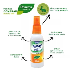O Repelente de Insetos Away Spray Pharma 100ml é a escolha perfeita para quem busca proteção completa contra mosquitos transmissores de doenças como Dengue, Zika, Febre Amarela, Chikungunya, Malária e outros. Desenvolvido pela Pharma Cosméticos, empresa reconhecida pela qualidade desde 1991, este repelente combina eficácia comprovada com uma fórmula suave que mantém a pele macia e hidratada.