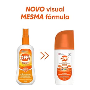Informações Adicionais do Produto: OFF Family Spray possui fórmula não oleosa com aloe vera Repele mosquitos que podem transmitir Zika, Dengue, Chikungunya e Febre amarela Garante proteção por até 4h Ideal para atividades ao ar livre Pode ser utilizado por toda família (crianças acima de 2 anos de idade)