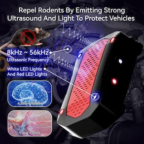 Repelente ultrassônico de mouse para carro. buzzkick - Repelente ultrassônico de roedores sob o capô: o repelente ultrassônico de mouse para carro emite ondas ultrassônicas de 8 kHz a 56 kHz para atacar o sistema auditivo de roedores; emite luzes LED brancas e luzes LED vermelhas para perturbar o sistema visual dos roedores, repelindo roedores prejudiciais. O ultrassom e as luzes emitidas não prejudicam humanos e animais, protegendo o veículo - Repelente ultrassônico de pragas 3 em 1: este repelente ultrassônico de animais é um repelente 3 em 1 com 3 métodos de carregamento. O método 1 é usar quatro pilhas alcalinas "AA" para carregar (o pacote não contém baterias). O método 2 é conectar a bateria do veículo ao cabo CC para carregar. O método 3 é conectar o carregamento USB. Durará até 45 dias com uma única carga - Repelente de esquilo com economia de energia: o repelente de esquilo tem função de detecção de vibração e o modo de trabalho é aberto automaticamente após o carro parar por 5 minutos. Quando o carro está em movimento, o repelente de mouse muda automaticamente para o modo de espera, economizando energia da bateria - Fácil de instalar: se 4 pilhas AA estiverem instaladas para carregamento, não há necessidade de conectar ao fio, e o carregamento sem fio pode ser realizado. Fácil de instalar em qualquer carro, trator, barco ou outros veículos usando abraçadeiras. Fácil de instalar, sem necessidade de conectar, bom para lugares sem eletricidade - Universal em qualquer cena: este repelente de ratos é feito de materiais resistentes a altas temperaturas e pode ser utilizado com segurança mesmo em ambientes de alta temperatura. A área de cobertura efetiva de cada repelente é de até 28 metros quadrados, e é recomendado instalar mais de dois quando o problema com roedores for sério. O repelente de roedores é tão pequeno que pode ser utilizado em uma variedade de lugares, como compartimento de motor de carros, garagem, trailer, sótão, porão, armazém, celeiro, cozinha, sala de estar, etc