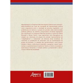 Representação no Congresso Nacional analisa a democracia representativa brasileira por meio da concepção de representação política como congruência entre o resultado do processo legislativo e as preferências de eleitores e grupos de pressão sobre determinadas políticas públicas. As análises compreendem iniciativas legislativas que tramitaram no Congresso Nacional durante os governos Dilma Rousseff e Michel Temer e que exprimiram forte divergência em relação aos interesses de grupos de pressão representativos de “trabalhadores” e “industriais” em diversas áreas temáticas. Ao relacionar as predileções do eleitorado com as manifestações de grupos de pressão e a atuação dos parlamentares, como poucos estudos o fazem, a obra busca responder a pergunta: a quem representam os parlamentares brasileiros? Assim, é leitura necessária a quem busca interpretar o contexto político e compreender a democracia no Brasil da atualidade.