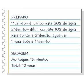Diluições: 01 parte do produto em: 05 partes de água acabamento brilhante 07 partes de água acabamento semi-brilhante 10 partes de água acabamento fosco