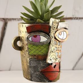 Material: resina Peso: 734 g Tamanho: 18,5 x 18 x 22,5 cm Design abstrato inspirado em Picasso — Um vaso de flores exclusivo com padrões faciais geométricos coloridos adiciona uma declaração artística ousada à decoração de casa, escritório ou jardim. Material de resina durável — Feito de resina premium, este vaso é robusto, leve e resistente ao desbotamento para uso interno e externo de longa duração. Ampla abertura para plantio — Design espaçoso adequado para suculentas, cactos, ervas e flores pequenas, oferecendo versatilidade para diferentes arranjos de plantas. Acento decorativo artístico — perfeito para colocação em mesa, varanda, pátio, sala de estar ou entrada, combinando vegetação com estilo abstrato de arte moderna. Dimensões do produto — Mede 18,5 x 18 x 22,5 cm, pesa 734 g; tamanho prático para exibição em mesa ou prateleira, fazendo com que as plantas se destaquem em qualquer espaço.