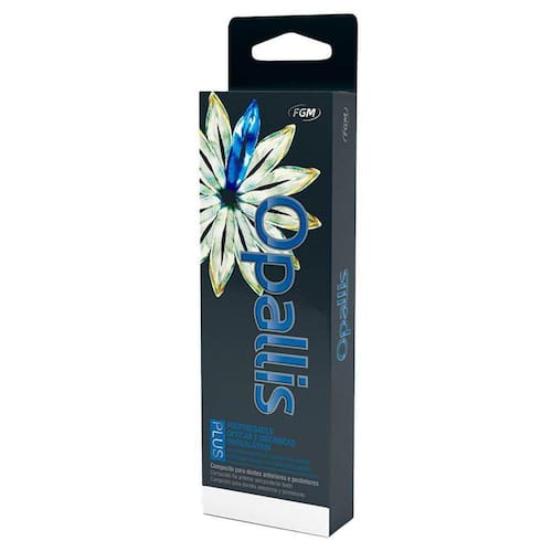 Resina Opallis Refil DA2 4g - FGM Resina Opallis Refil 4g é indicado para restauração direta de dentes anteriores e posteriores. Facetas diretas em resina composta. Colagem de fragmento de dentes. Reduzir ou fechar diastemas. Corrigir ou alterar a forma de um ou vários dentes. Defeitos estruturais: Amelogênese Imperfeita, hipoplasias de esmalte, lesões cervicais não cariosas. Para corrigir ou alterar a proporção largura ou comprimento do dente. Restauração de dentes decíduos. Corrigir ou alterar a cor de uma parte ou de todo o dente. Embalagem com 1 seringa de 4g. Apresentação Benefícios: Polimento fácil e duradouro com brilho semelhante ao da estrutura dental; As cores seguem a escala Vita Classical com fidelidade; Excelente radiopacidade; Opalescência idêntica à dos dentes naturais; Fluorescência balanceada com a da estrutura dental; Elevado grau de conversão; Reduzido desgaste e rugosidade superficial contribuindo na manutenção do brilho e longevidade da restauração; Embalagem ergonômica, com tampa acoplada ao corpo da seringa; Reduzida sensibilidade à luz. Características: Consistência: Composta. Peenchimento: 1,5mm. Composição: Bis (GMA), Bis (EMA), UDMA e TEGDMA, vidro de Bário-Alumino silicato silanizados e nanopartículas de dióxido de silício, canforquinona como fotoiniciador, aceleradores, estabilizantes e pigmentos. Resina composta nanohíbrida (microhíbrida com partículas nano). Opalescência. Fluorescência equilibrada com os tecidos duros dos dentes naturais. Excelente polimento. Superfície com brilho similar à superfície dos dentes naturais. Variedade de cores. Amplo espectro de indicações para dentes anteriores e posteriores; Reduzida sensibilidade à luz ambiente. Excelente radiopacidade. Excelentes propriedades físicas. As cores de esmalte e dentina de Opallis seguem com fidelidade à escala Vita Clássica, sendo controladas por espectrofotômetro. Fácil identificação das cores através das letras: E (esmalte), D (dentina), T (translúcidas), O (extra-opacas), V (valor). Os termos E-Bleach H, E-Bleach M, E-Bleach L definem a ordem de croma, sendo que H se refere à cor mais clara (high) e L à cor de maior croma (low). Para reproduzir a dentina, foi desenvolvida a cor D-Bleach com opacidade semelhante às cores de dentina.
