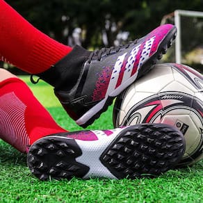 PU + TPU + Borracha Couro de alta qualidade superior e forte colar de tecido elástico pode proteger o tornozelo com segurança. Tamanho europeu padrão real, boa forma, tampa de fusão quente elástica fixada no último sapato e na biqueira dianteira para proteger os dedos dos pés durante as filmagens frequentes. As costas são cobertas com uma tampa de nylon, que tem a mesma forma que o tornozelo para proteger o calcanhar. Ao mesmo tempo, é um constritor cruzado. O forro têxtil é laminado com espuma ultra-espessa para manter os pés extremamente confortáveis. e respirável. A sola flexível do solo pode ser controlada e estabilizada em alta velocidade em solo duro (grama l seca), grama artificial (fibra sintética de lâmina longa) e grama dura. A equipe de trabalho profissional adota uma boa tecnologia de processo de fabricação. produção para garantir alta qualidade e manter um bom desempenho. É adequado para gramados internos AG / TF.