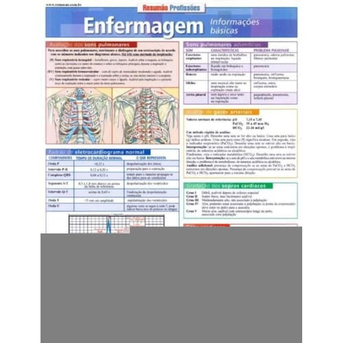 Apresenta os seguintes temas - avaliação dos sons pulmonares; padrão de eletrocardiograma normal; as enzimas cardíacas; sons cardíacos; tipos de insulina e tempo de ação; força e resistência muscular; análise de sintomas; estágios de comprometimento dos tecidos em ferimentos; abreviaturas médicas comuns; locais de injeção intramuscular; pontos de controle circulatório; edema; pulsação; cálculo para gotejamento de soro; equivalências métricas caseiras e farmacêuticas; hemograma completo; avaliações técnicas; eletrólitos do soro; estudos de coagulação; sinais de alerta de câncer.