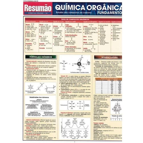 Fundamentos do estudo dos compostos de carbono; Tipos de compostos orgânicos; Fórmulas e isômeros; Nomenclatura; Ligação química em compostos orgânicos; Modelo de mecânica quântica - teoria do orbital molecular; Forças intermoleculares; Reações orgânicas - ácidos e bases, oxirredução, reações de adição, de substituição, de eliminação, de hidrólise, de condensação, reações iônicas e radicais; Espectroscopia e métodos instrumentais; Termodinâmica; e Cinética - velocidade da reação química.