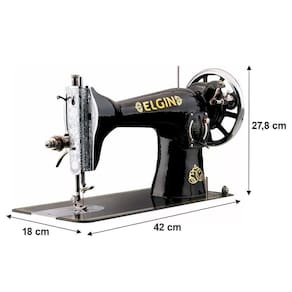 Máquina de costura reta doméstica com corpo em ferro fundido e eixo de transmissão em aço. Realiza costura reta com regulagem de comprimento e costura para trás. Inclui enchedor de bobina. O móvel é tradicional com 2 gavetas e pés de ferro.Funções