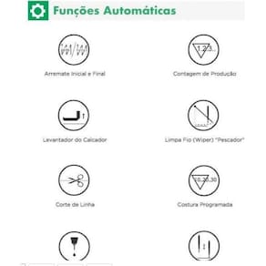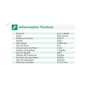 - Máquina de Costura Reta Eletrônica; - 1 Agulha; - Lubrificação Automática; - Corte de Linha; - Motor direct drive silencioso; - Parada de Agulha em cima embaixo; - Luz de led; - Arremate inicial e fina; - Levantamento automático do calcador; - Retrocesso automático; - Voltagem 220v; - Caso cliente solicite enviamos transformador para trabalhar na voltagem 110 V sem custo adicional; - Maquina enviada completa com mesa e pé desmontadas.