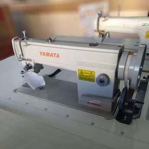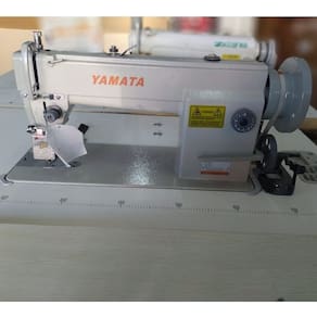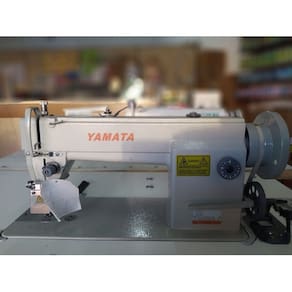Máquina de costura Industrial Nova, Tipo Reta, Marca Yamata, uma agulha, 4500rpm, lubrificação automática, ponto até 8 mm, completa com conjunto de montagem composto por: tampo de madeira revestido em fórmica impermeável, estante de ferro, motor importado (silencioso) 1/2hp 110/220 v com chave de reversão de voltagem e velocidade e acessórios para manutenção.