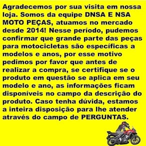 Agradecemos Por Sua Visita Em Nossa Loja. Somos Da Equipe Dnsa E Nsa Moto Peças, Atuamos No Mercado Desde 2014! Nesse Período, Pudemos Confirmar Que Grande Parte Das Peças Para Motocicletas São Específicas A Modelos E Anos, Por Esse Motivo Pedimos Por Favor Que Antes De Realizar A Compra, Se Certifique Se O Produto Em Questão Se Aplica Em Seu Modelo E Ano, As Informações Ficam Disponíveis No Campo Da Descrição Do Produto. Caso Tenha Dúvida, Estamos A Inteira Disposição Para Lhe Atender Através Do Campo De Perguntas.