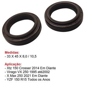 Retentor garfo bengala virago 250 crosser 150 x max 250 par Produto com vedação dupla 2 molas Características e benefícios: - produzido com melhores equipamentos garantindo segurança e durabilidade; - oferecendo o melhor custo beneficio, unindo qualidade e eficiência na sua utilidade; - antes de efetuar a compra, verifique se realmente é essa a peça que deverá ser trocada na sua motocicleta. Quantidade embalagem: - 02 retentores de bengala duas peças Posição: - guarfo bengala cilindro dianteiro Cor: - preto Medidas: - 33 x 45 x 8,0 / 10,5 Aplicação: - xtz 150 crosser 2014 em diante - virago vx 250 1995 até2002 - x max 250 2021 em diante - yzf 150 r15 todos os anos Marca: Não Informado Ean: 7808388463805