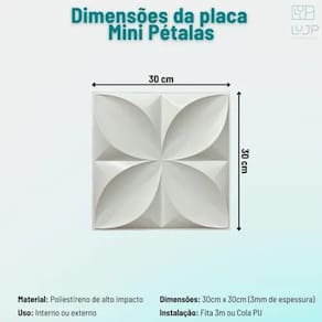 Revestimento 3d Parede Placa Pvc 30x30cm Kit 25un + Fita 3m Modelos: Branco Quantidade: 25 Placas Material: Poliestireno Alto Impacto Modelo: Mini Pétalas Cor: Branco ou preto com acabamento fosco e corte a laser. Espessura: 0.3mm Tamanho: 30cm x 30cm Nossas placas de poliestireno são exclusivas com corte a laser, oferecendo um acabamento fosco único no mercado, totalmente diferente do que você já viu. Fáceis de instalar, resistentes e adaptáveis, nossas placas transformam seus espaços com praticidade e estilo Instalação fácil, sem necessidade de . Material resistente, com relevo que não amassa nem afunda. Instalação limpa, sem quebra-quebra. Ideal para paredes com umidade, mofo, textura, madeira e azulejo. Perfeito para ambientes internos e externos. Lavável para manter sempre como novo. de durabilidade por 10 anos. Dispensa pintura, economizando tempo e dinheiro. Fácil instalação com fita 3M, cola de contato ou cola PU. Cortes precisos feitos a laser para um resultado impecável. Transforme seu espaço com praticidade e estilo Área externa: Instalação com cola de contato e pintura obrigatória com tinta a base de água Área interna: instalação com fita dupla face, cola pu ou cola de contato e pintura opcional. A cor das placas nas fotos é igual à cor real do produto Resposta: As placas são na cor branca ou preta. Porém você pode aplicar tinta a base de água na cor de sua preferência, após a instalação. Posso colar as placas na parede com textura Resposta: Sim, você pode colar as placas em paredes com textura, desde que não seja chapiscado, mas é importante usar um adesivo de montagem adequado para garantir uma fixação segura. Qual é o peso de cada placa As placas acompanham fita dupla face Resposta: Sim, esse anuncio já acompanha a fita dupla face 3m para facilitar sua instalação As placas se encaixam conforme o vídeo Resposta: Sim, nossas placas são projetadas para se encaixar de forma fácil e eficiente, conforme mostrado no vídeo demonstrativo. Preciso de uma quantidade maior do que a disponível no anúncio. Posso encomendar mais Resposta: Sim, se precisar de uma quantidade maior do que a disponível, basta solicitar e nós calculamos a quantidade de acordo com as medidas fornecidas e indicamos outro anúncio correspondente para efetuar a compra. Posso usar as placas 3D em áreas externas descobertas Resposta: Sim, nossas placas são adequadas para uso em áreas externas descobertas, desde que instaladas corretamente e de acordo com as orientações do fabricante. Elas são resistentes a condições climáticas, mas recomendamos consultar as especificações de cada modelo para garantir a durabilidade ideal.