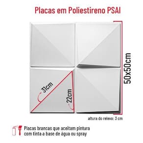 Quantidade do anuncio: 1m 4 placas Modelos: CUBOS Todas as placas são da cor branca As placas são de poliestireno PSAI plástico Tamanho: 50x50cm exceto modelos piramidal e prisma 48x 48cm Espessura: 0,5 mm ============================================================= 10 motivos do porquê você deve comprar as nossas placas 3D 1- Você mesmo consegue instalar, não precisa de um profissional; 2- Material resistente, o relevo não amassa e não afunda; 3- Instalação sem sujeira e sem quebra quebra; 4- Ideal para paredes com umidade, mofo, textura, madeira e azulejo; 5- Serve tanto para áreas internas, quanto externas; 6- É lavável; 7- Durabilidade de 10 anos; 8- Não precisa de pintura; 9- Instalação com fita dupla face ou cola de contato; 10- Cortes das placas é a laser. ============================================================= Fixação: Cola de contato secagem rápida , fita dupla face ou cola PU fixação 24 horas Ambiente: Interno e externo, podendo ser instalado sobre umidade, mofo, textura, vidro e madeira. Pintura: Tinta a base de água, acrílica, acetinado ou fosco. A pintura pode ser feita com compressor de ar, pincel ou spray.