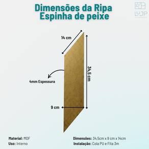 Quantidade: 20 unidades Modelo: Ripa Espinha de Peixe Material: MDF Uso indicado: Ambientes internos Espessura: 4 mm Acabamento uniforme e design moderno Produto leve e fácil de manusear