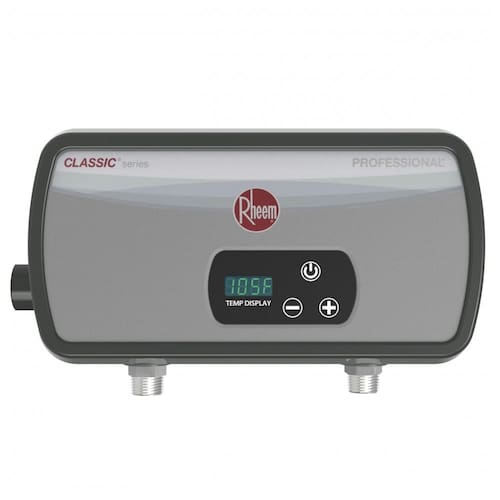 O Aquecedor Elétrico Sem Tanque Termostático Rheem Professional de 3,5kW é ideal para aplicações residenciais e comerciais leves, proporcionando água quente instantânea e economizando água ao eliminar o tempo de espera para que a água quente alcance a torneira. Projetado para ser instalado diretamente no ponto de uso, é perfeito para ambientes com baixa vazão, como banheiros, bares molhados ou pias de garagem. Sua instalação requer conexão direta a 120 volts e um disjuntor bipolar de 30 amperes, garantindo segurança e eficiência. Compacto e econômico, este aquecedor é até 98% menor do que um aquecedor elétrico convencional, ideal para espaços reduzidos como escritórios e cozinhas pequenas. O controle termostático permite ajustes precisos de temperatura em incrementos de 1 grau, variando de 27°C a 60°C, oferecendo água quente consistente sob demanda. Além disso, o aparelho deve ser montado na posição vertical, com as conexões de entrada e saída de água na parte inferior, facilitando a instalação sem necessidade de ventilação.
