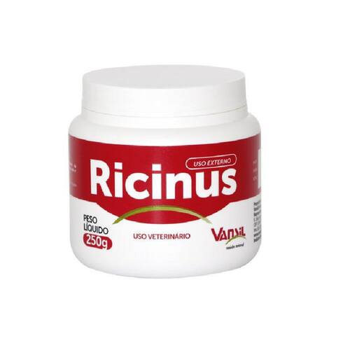 Ricinus é um produto completo para a hidratação da pele dos animais domésticos. Fórmula: Cada 100 g contém: Óleo de Ricino......................10 g Veículo .S.P.......................100 g Uso Tópico Aplicar uma fina camada sobre a pele do animal. Marca: Não Informado