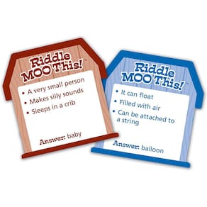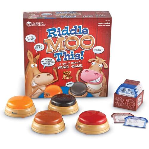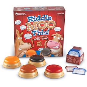 Construa vocabulário e habilidades de pensamento crítico. Cock-a-doodle você sabe a resposta? Aumente as habilidades de raciocínio dedutivos e o vocabulário com este emocionante jogo de enigmas. "É uma fruta, pode ser vermelho, e ele tritura quando você dá uma mordida." Buzz se você sabe a resposta. Possui 2 níveis de jogo (substantivos comuns apropriados para a idade) e cartas Barnteaser para um desafio de pensamento crítico. Inclui 4 buzzers de som animal e 150 cartões de duplas laterais. Notas K+.