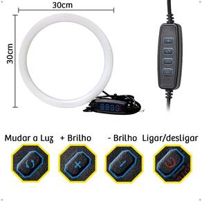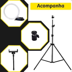 Embalagem contém: 1 - Ring Light 12 30cm ; 1 - Adaptador de celular; 1 - Tripé altura máxima de 2,1m ; 1 - Controle de intensidade de iluminação.