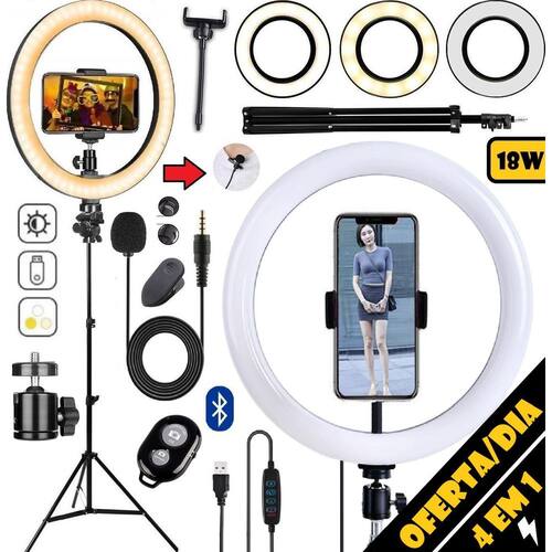 Ring light 26cm iluminador anel led circular completo + tripé profissional microfone de lapela controle bluetooth selfie Kit com eletrônica Kit ring light + tripé 2,10m + microfone lapela acompanha controle disparador bluetooth Com este modelo você consegue usar o celular tanto na vertical quanto na horizontal Possui também ball head permite rotação de 360º do ring Iluminador ring light de 26 centímetros, desenvolvido para maquiadores, fotógrafos, cinegrafistas e etc, que buscam uma ótima maneira de iluminar com perfeição. Ring light led é um iluminador com ajuste de até 10 níveis de intensidade de luz, 03 tonalidades de cor, quente, fria e mesclada quente e fria ao mesmo tempo , alimentado através de um cabo usb, devendo estar sempre conectado a uma fonte de energia para acender. A base composta por um tripé, um encaixe articulado, o que possibilita fácil ajuste de altura e do ângulo que deseja posicionar sua luz. Todas as peças são encaixadas através de rosca. Aviso: entrada usb do produto é compatível com fonte/carregador de celular Características: - alimentação: usb - voltagem: bivolt - tipos de luz: quente, fria e mesclada. - temperatura da cor: 3500k / 6500k - dimensões aproximadas do led axlxp : 26x26x1,5cm - altura aproximada do tripé com encaixe articulado: 15cm - material do tripé: ferro - tamanho aproximado do cabo: 1,5m - cabo com controle de liga/desliga, tipo de cor e intensidade de luz. Informações técnicas: - 10 níveis de intensidade de luz - 03 tipos de tonalidade de luz quente, fria e mesclada - suporte articulado - tripé com ajuste de altura Está incluso também o suporte pra colocar o celular no meio do ring light Microfone de lapela profissional para profissionais exigentes que buscam melhorar a qualidade seus vídeos sem um alto investimento. Microfone para uso em celulares sem necessidade de uso de adaptadores. Características: - alta sensibilidade, alta dinâmica, ampla resposta de freqência. - clipe giratorio permite que você prenda facilmente em sua gola, gravata ou no bolso. - uma tampa de espuma protege seu microfone do ruído do vento e cuspir. - portátil com tamanho de cabo de 1,5 metros. - ótimo para áudio na gravação de vídeos, entrevistas , podcasts... Controle remoto bluetooth celular É um produto que foi desenvolvido para facilitar a vida dos usuários de smartphones que adoram tirar aquela selfie sozinho ou com a galera. Com ele, você pode facilmente tirar fotos ou fazer vídeos sem precisar tocar no seu aparelho Atenção a cor do controle bluetooth é escolhida aleatoriamente, conforme a disponibilidade em Itens inclusos: 1 ring light 10 polegadas 26cm 1 tripé profissional com 2,10m de altura 1 ball head permite rotação de 360º do ring 1 suporte para celular 1 controle de intensidade e troca de temperatura embutido no fio 1 microfone de lapela profissional 1 controle bluetooth para fotos e vídeos Melhor kit custo benefício.