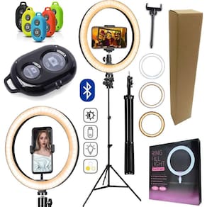 Ring light 26cm iluminador anel led circular completo + tripé profissional microfone de lapela controle bluetooth selfie Kit com eletrônica Kit ring light + tripé 2,10m + microfone lapela acompanha controle disparador bluetooth Com este modelo você consegue usar o celular tanto na vertical quanto na horizontal Possui também ball head permite rotação de 360º do ring Iluminador ring light de 26 centímetros, desenvolvido para maquiadores, fotógrafos, cinegrafistas e etc, que buscam uma ótima maneira de iluminar com perfeição. Ring light led é um iluminador com ajuste de até 10 níveis de intensidade de luz, 03 tonalidades de cor, quente, fria e mesclada quente e fria ao mesmo tempo , alimentado através de um cabo usb, devendo estar sempre conectado a uma fonte de energia para acender. A base composta por um tripé, um encaixe articulado, o que possibilita fácil ajuste de altura e do ângulo que deseja posicionar sua luz. Todas as peças são encaixadas através de rosca. Aviso: entrada usb do produto é compatível com fonte/carregador de celular Características: - alimentação: usb - voltagem: bivolt - tipos de luz: quente, fria e mesclada. - temperatura da cor: 3500k / 6500k - dimensões aproximadas do led axlxp : 26x26x1,5cm - altura aproximada do tripé com encaixe articulado: 15cm - material do tripé: ferro - tamanho aproximado do cabo: 1,5m - cabo com controle de liga/desliga, tipo de cor e intensidade de luz. Informações técnicas: - 10 níveis de intensidade de luz - 03 tipos de tonalidade de luz quente, fria e mesclada - suporte articulado - tripé com ajuste de altura Está incluso também o suporte pra colocar o celular no meio do ring light Microfone de lapela profissional para profissionais exigentes que buscam melhorar a qualidade seus vídeos sem um alto investimento. Microfone para uso em celulares sem necessidade de uso de adaptadores. Características: - alta sensibilidade, alta dinâmica, ampla resposta de freqência. - clipe giratorio permite que você prenda facilmente em sua gola, gravata ou no bolso. - uma tampa de espuma protege seu microfone do ruído do vento e cuspir. - portátil com tamanho de cabo de 1,5 metros. - ótimo para áudio na gravação de vídeos, entrevistas , podcasts... Controle remoto bluetooth celular É um produto que foi desenvolvido para facilitar a vida dos usuários de smartphones que adoram tirar aquela selfie sozinho ou com a galera. Com ele, você pode facilmente tirar fotos ou fazer vídeos sem precisar tocar no seu aparelho Atenção a cor do controle bluetooth é escolhida aleatoriamente, conforme a disponibilidade em Itens inclusos: 1 ring light 10 polegadas 26cm 1 tripé profissional com 2,10m de altura 1 ball head permite rotação de 360º do ring 1 suporte para celular 1 controle de intensidade e troca de temperatura embutido no fio 1 microfone de lapela profissional 1 controle bluetooth para fotos e vídeos Melhor kit custo benefício.