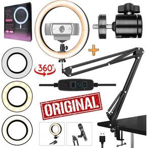Ring light aro luz de led iluminador hing + suporte mesa pedestal bancada braço articulado webcam universal 1/4 estúdio Ring ligth 10 26cm de led potência led 18w com braço articulado Acompanha suporte para webcam. Agora seus vídeos vão ficar profissionais com este incrível ring light 26cm,ele vai pronto para uso e fácil utilização.Com 3 tipos de cores sua iluminação estará completa. Iluminação de led para estúdio, home estúdio, ring light 10 polegadas, com adaptador ball head 360º que permite ajuste de angulação do dispositivo de gravação. Iluminação regulável 3 cores e 10 níveis de intensidade de luz lâmpada anel + controle de iluminação + ball head 360 graus. Iluminador ring light 10 polegadas, desenvolvido para maquiadores, fotógrafos, cinegrafistas e etc, que buscam uma ótima maneira de iluminar com perfeição. Com ajuste de ângulo com suporte articulado. Com controle de temperatura e da cor da lâmpada. Ligado através de cabo usb Você pode utilizar um adaptador de tomada de celular para ligar ou conectar no usb do computador ou outro equipamento que forneça 5v usb. O cabo usb deverá estar sempre ligado para funcionar. Características: - alimentação: usb - voltagem: bivolt - tipos de luz: quente, fria e mesclada. - temperatura da cor: 3500k / 6500k - dimensões aproximadas do led axlxp : 26x26x1,5cm - tamanho aproximado do cabo: 1,5m - cabo com controle de liga/desliga, tipo de cor e intensidade de luz. Informações técnicas: - 10 níveis de intensidade de luz - 03 tipos de tonalidade de luz quente, fria e mesclada Suporte braço articulado Braço articulado de mesa muito utilizado em estúdios, rádios, home estúdios, studios, produtores, radialistas, youtubers, para lives e vídeos. É perfeito para instalação em mesas de todos os tipos, com uma rotação de 270 ele tem muito mais flexibilidade para alcançar o ângulo que você quiser, com suporte ajustável que faz com que você não precise ficar se inclinando, coloque o seu microfone ou ring light na altura que você quiser, o suporte facilita na hora de carregar seu braço articulado para qualquer lugar. Capacidade de carga: 1,5 quilograma Material: alumínio de alta densidade e abs Medidas: 35cm x 35 cm x 8 cm Braço: 35 cm x 35 cm de comprimento de cada lado mais base de 8cm totalizando 78cm Peso: 565 gramas -o kit contém: 1 anel ring light de led 26cm 1 cabo usb com controle de luz 1 presilha braçadeira de mesa 1 adaptador ball head 360 1 suporte braço articulado de aço Melhor kit custo benefício. Importante: Kit acompanha uma unidade de cada item Não acompanha webcam ou outros dispositivos